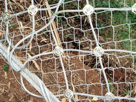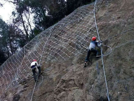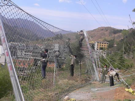 邊坡防護網有主動防護與被動防護,主動防護系統是以鋼絲繩網為主的各類柔性網覆蓋包裹在所需防護斜坡或巖石上,以限制坡面巖石土體的風化剝落或破壞以及為巖崩塌(加固作用),或將落石控制于一定范圍內運動(圍護作用)。被動防護是由鋼絲繩網、環形網、(需攔截小塊落石時附加一層鐵絲格柵)、固定系統(錨桿、拉錨繩、基座和支撐繩)減壓環和鋼柱四個主要部分構成。鋼柱和鋼絲繩網連接組合構成一個整體,對所防護的區域形成面防護,從而阻止崩塌巖石土體的下墜,起到邊坡防護作用。