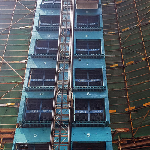 門面設計優點:門面采用小孔鋼板網或電焊網片與鋼板組合構成。一方面可以防止等候人員伸手開門,又便于人貨電梯操作人員觀察樓內情況,利于樓內外雙方工作人員溝通交流。高強冷軋鋼板同時也是小型汽車普遍采用的材料,可以抗擊300kg以上的沖擊力。并且噴涂警示語和擋腳警示線,對工地文明施工形象顯著提升。