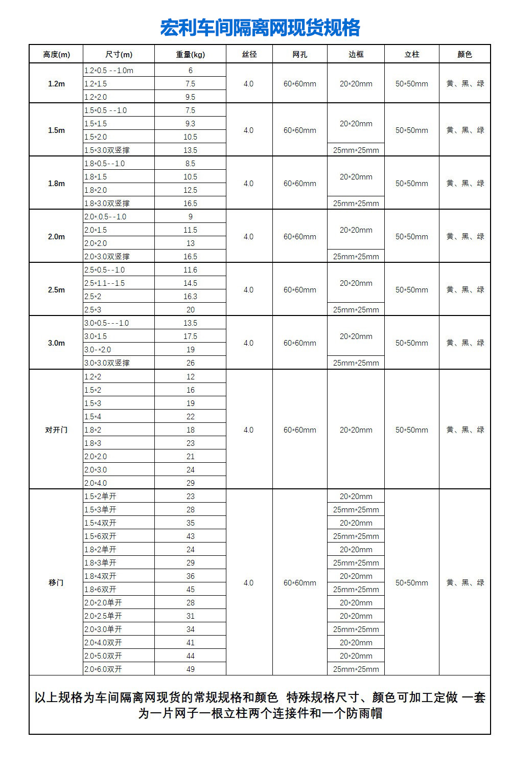 高 度:1.2m、1.5m、1.8m、2.0m、2.5m、3.0m
